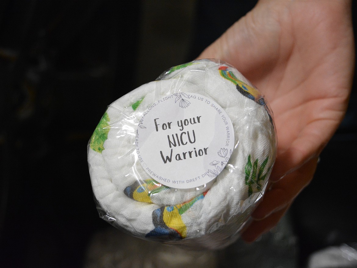 Items in the Fallon’s Flight NICU care cart include electrolytes, mouthwash, hair ties and pre-washed baby swaddles, journals, pens, notebooks, footprint pads, blankets, sleep sacks and pacifier holders.