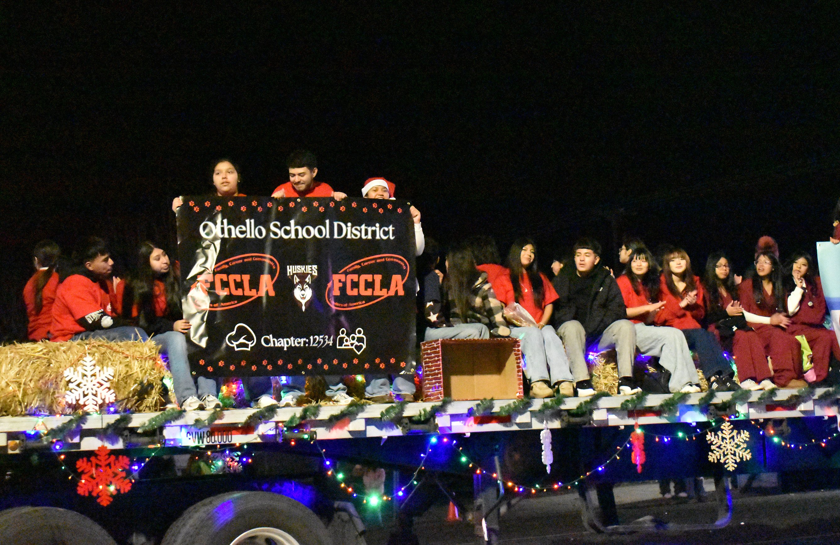 The parade started at East 14th Avenue and worked its way west down Main Street to East Third Street. A phalanx of emergency vehicles led the way, sirens blaring and lights flashing, followed by vehicles of every kind. The Othello High School cheerleaders led cheers from a flatbed trailer, a group of dancers in Aztec-themed Three Kings garb did a traditional dance behind the Sacred Heart Catholic Church float and the Grinch himself rode atop the city of Othello’s float. The OHS Drill Team received a $250 prize for the best float in the smaller category, and Montemayor Transport won the first prize of $500.