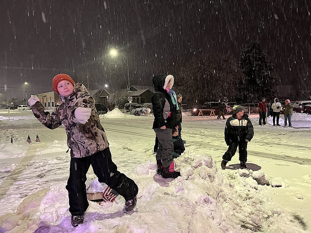 But before the Polson Chamber’s Parade of Lights got underway, kids took over the street in front of the VFW for a rambunctious snowball fight – a good thing too, since snow soon turned to rain and the three inches of white fluff were mostly gone by morning.