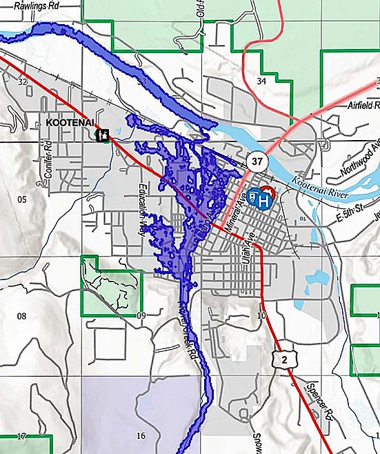 Areas potentially affected if the lower dam fails include Flower Creek Road, neighborhoods stretching to Education Way and the center of town including California Avenue and to the west of there as well as near the railroad tracks and along the Kootenai River.