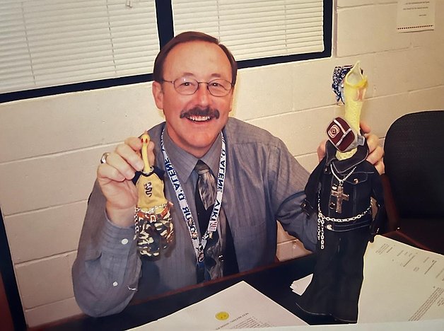 Steve Casey smiles as he holds up rubber chickens while seated in his office at Coeur d'Alene High. Casey served as vice principal from 1989 to 1993, then served as principal from 1993 to 2006. A beloved administrator who was known for working as hard as he played, Casey died Wednesday following three years with dementia and a recent rapid health decline.ARTICLES BY DEVIN WEEKS