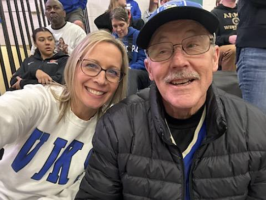 Tara Nelson, who is following in her dad's footsteps as an assistant principal at Coeur d'Alene High, watches a Coeur d'Alene vs. Lake City basketball game with her dad, Steve Casey, in January. Casey served as the principal of Coeur d'Alene High for 13 years before he retired in 2006. He died on Wednesday.