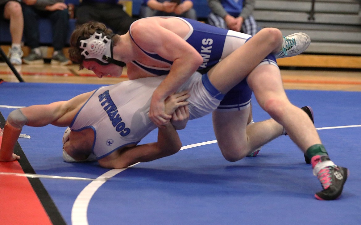 After a flurry of back-and-forth action to begin the 126-pound championship match, Weston took control in the second period and pinned Corvallis’ K. Hill in 2:46 to claim the 126 title, pinning his third of three opponents on the day.