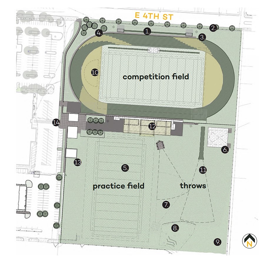 The athletic project includes 1,500 seat grandstands, a new football field, practice fields and a 10-lane track. The design currently details minimums for “base bids” with alternates to add more features, such as sidewalks or throwing fields.