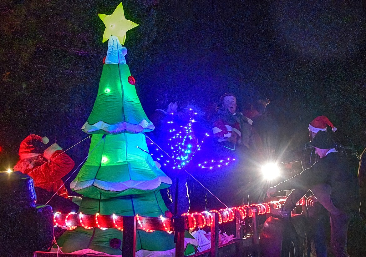The event brought a festive burst of brilliant lights to town as Christmas-decorated floats or “Christmas sleds” moved slowly along their assigned routes, preceded by a fire truck and followed by a police car, with sirens occasionally announcing the opportunity to share. It was quite a spectacle – despite the rain.