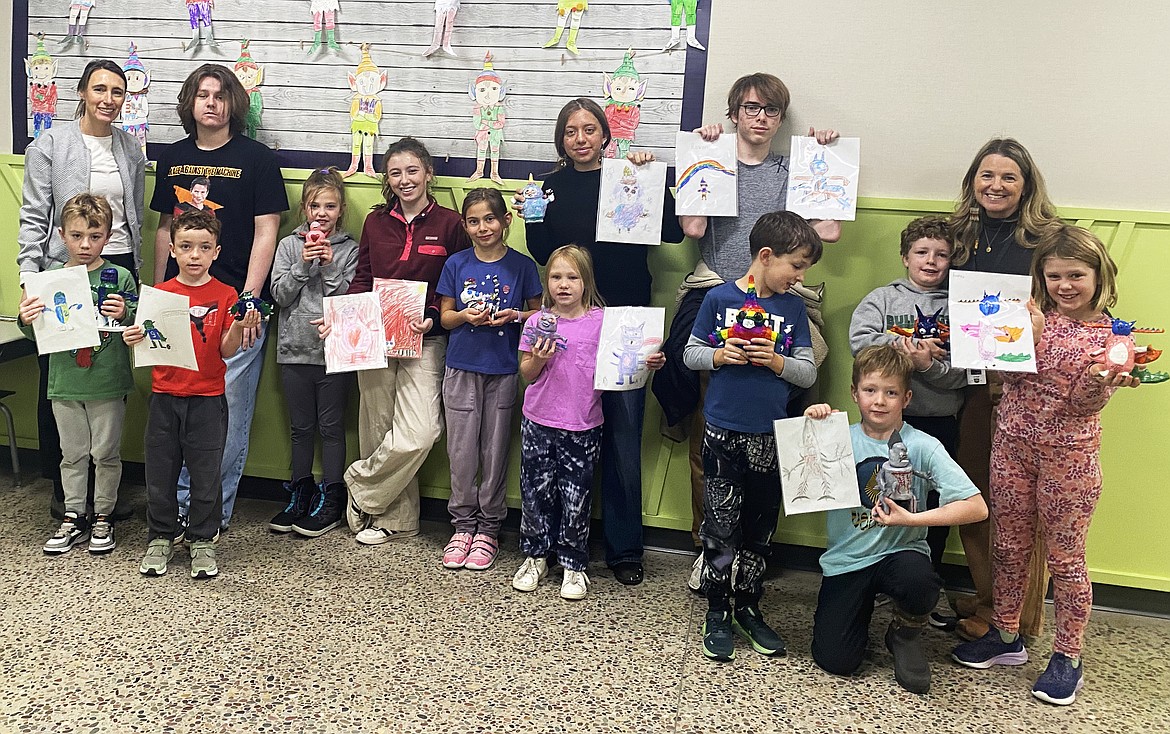 Eleven high school art students and 20 second-graders read “How I Met My Monster,” a book by Amanda Noll, about a boy named Ethan who finds several friendly monsters under his bed, each vying to become Ethan’s personal monster.