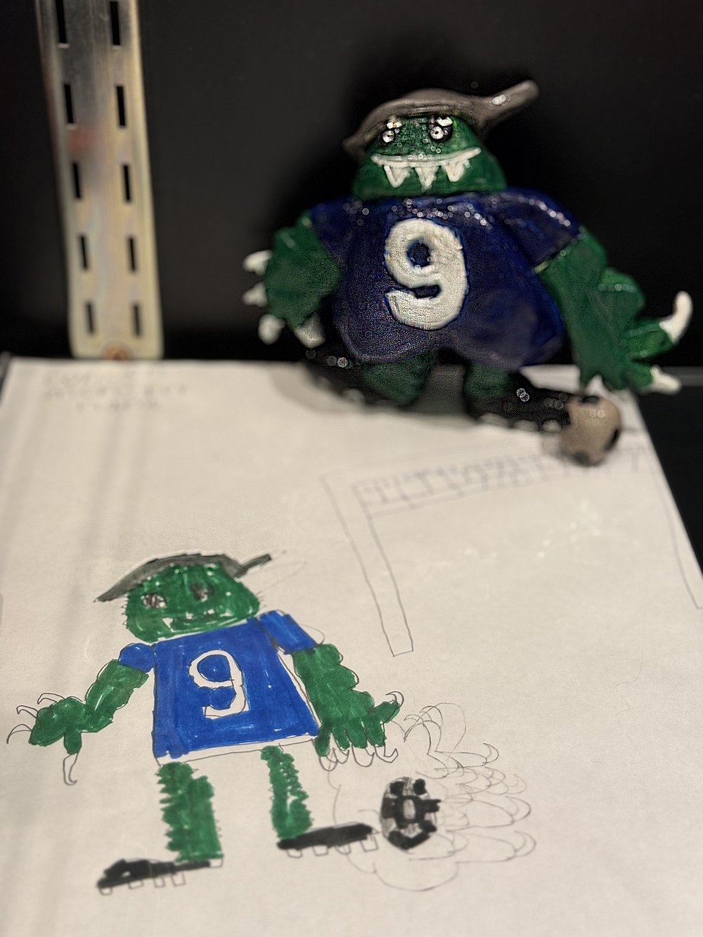 Ambrose Richardson drew Concon, a soccer-playing monster, wearing a number 9 jersey. Concon also sports jagged teeth and long claws. The blue beast will have other ceramic friends when Richardson puts him “next to my other clay things,” that he made in his grandma’s shop.