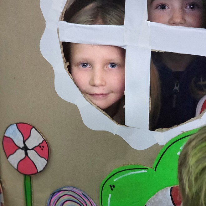One youngster said he “really liked” the peppermint doorknob, while Lyal, a kindergartner, was excited that kids could go inside. All the students were eager to check out every inch of the gingerbread creations, exploring the trim with inquisitive fingers, entering and exiting and peering through the windows.