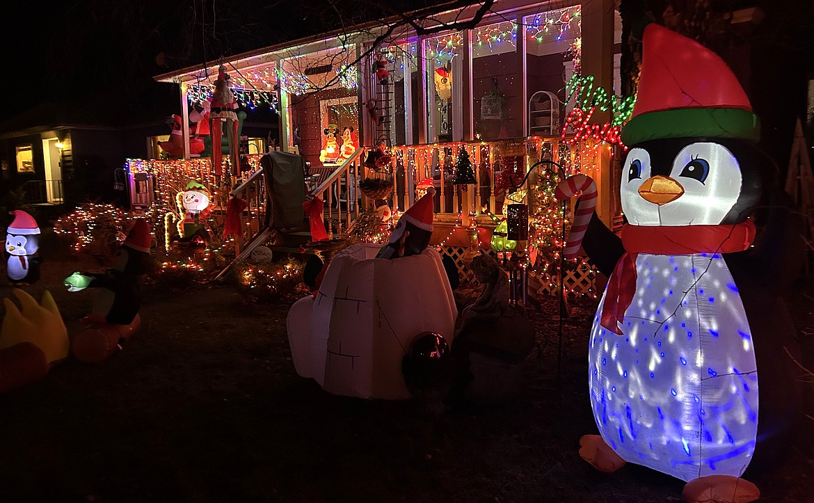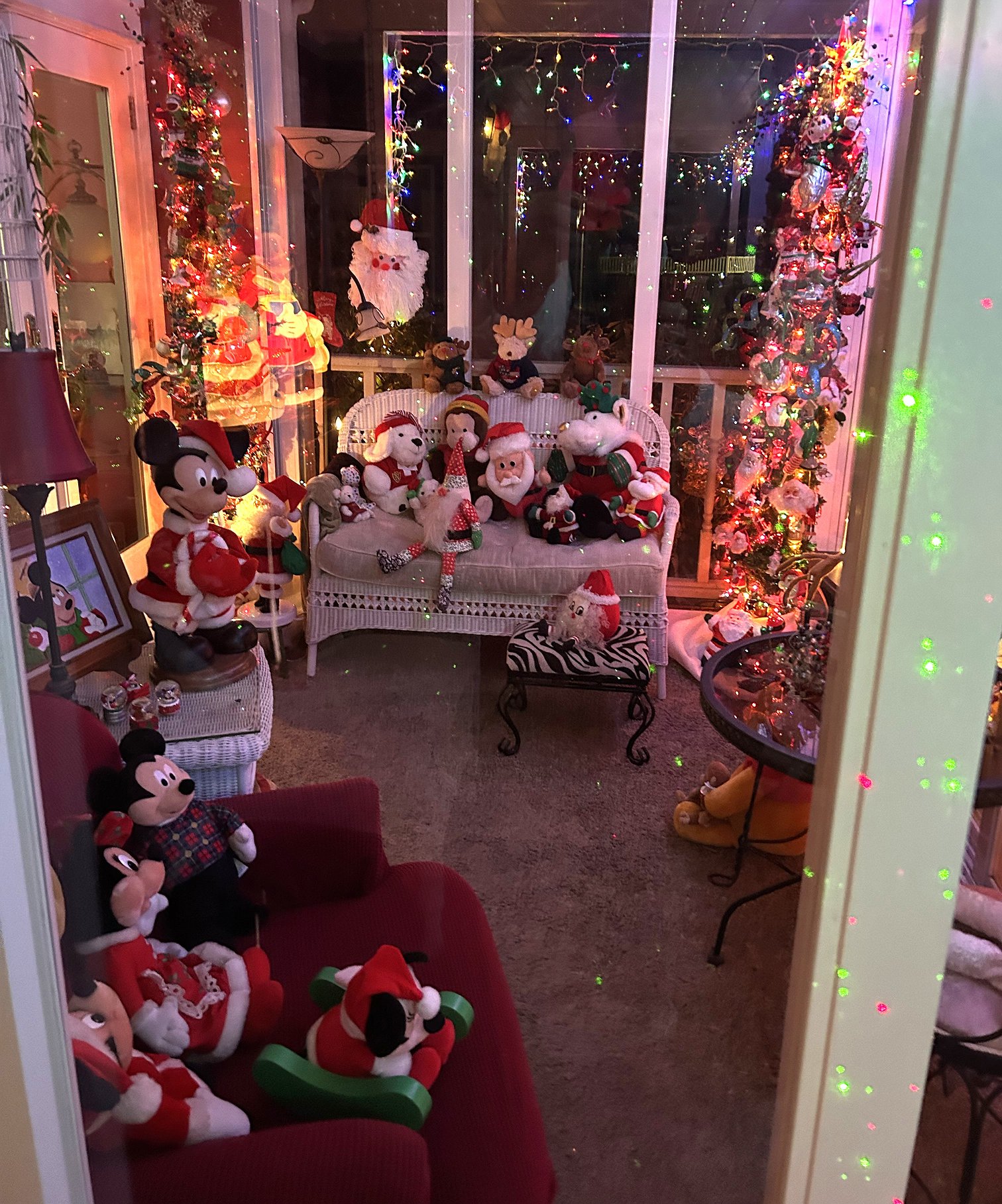 Over the years, the decorations multiplied: shrubs and trees were lined with lights. The front porch and the sunroom are home to Mickey and Minnie Mouse figures in Charles Dickens-like attire and Santas. Inflatable penguins and elves stand in the yard.