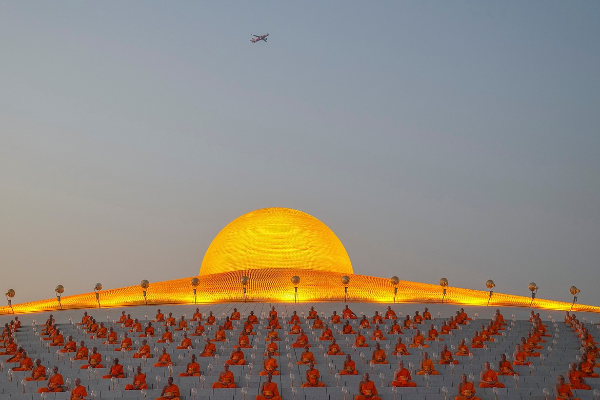 Thai Buddhist monks pray as they gather at Wat Dhammakaya temple to participate in Makha Bucha Day ceremonies in Pathum Thani, Thailand, Feb. 12, 2025. (AP Photo/Sakchai Lalit, File)