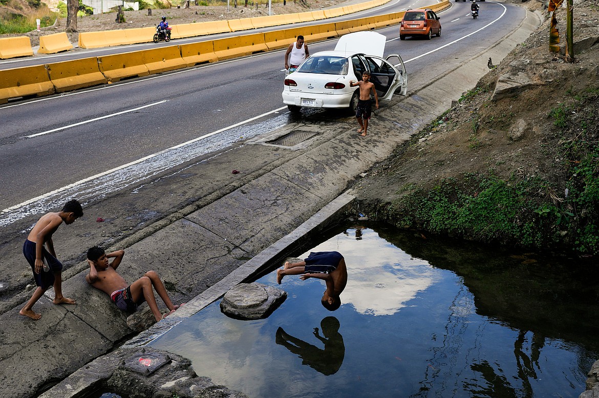 A boy dives headfirst into a drainage ditch a day after Venezuelan President Nicolás Maduro was inaugurated for a third term, in Caracas, Venezuela, Jan. 11, 2025. (AP Photo/Matias Delacroix, File)
