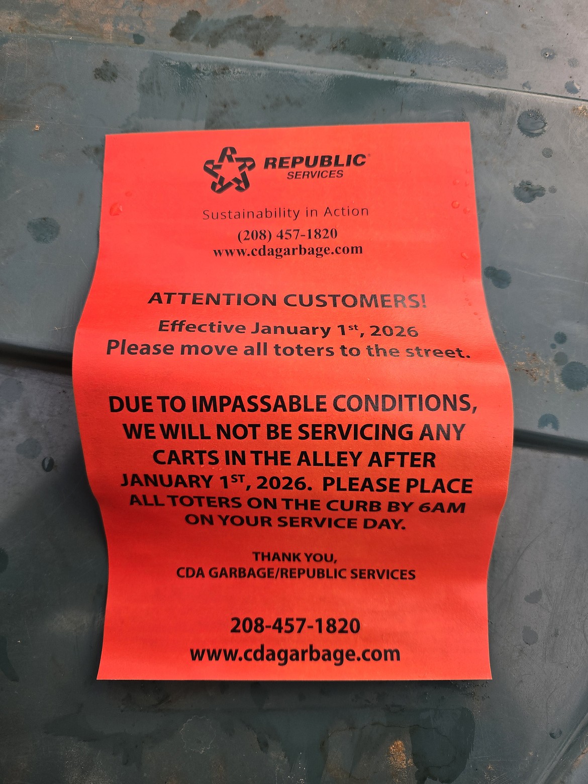Residents affected by the policy change have reached out to City Councilor and Mayor-elect Dan Gookin. He's acknowledged their concerns and has set up a meeting with the city administrator, attorney, and Republic Services.
