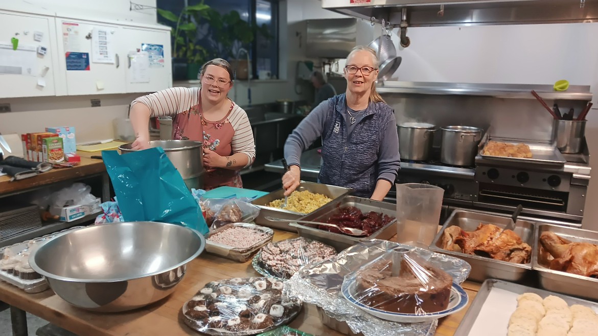 Helping in the kitchen was Glenda Harris, who had undergone knee replacement surgery just last month. Using a walker, she pitched in making potatoes alongside her granddaughter, Kat Martin. Martin had already committed to volunteering but wanted to be sure her grandmother would be okay. Harris was determined to help anyway.