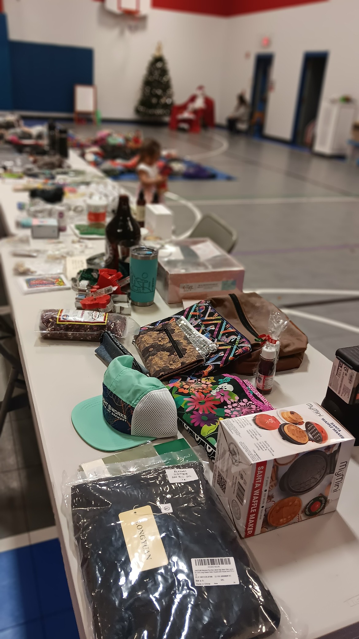 Volunteers had pre-committed to help, and as the evening approached, even more jumped in when they realized extra hands would help things run smoothly as guests arrived. Inside the gym, tables were set with brand-new gifts for children to choose for their parents or grandparents, many featuring Montana-made products donated by local businesses and vendors.