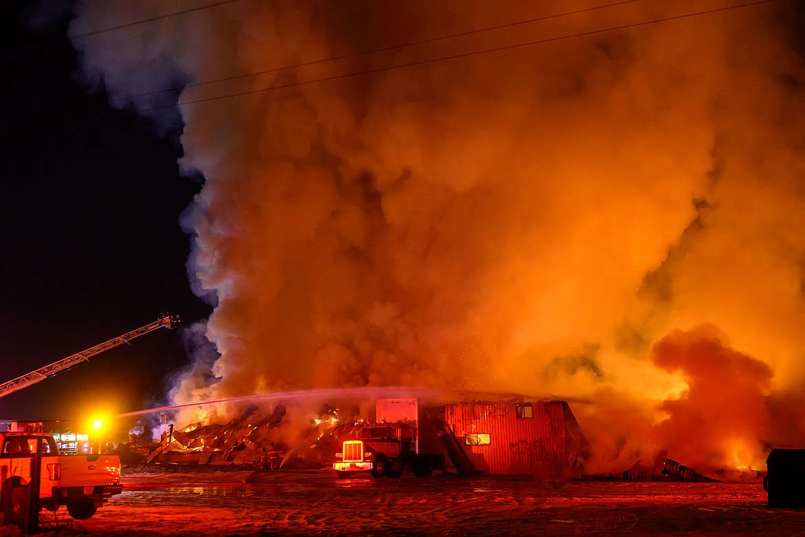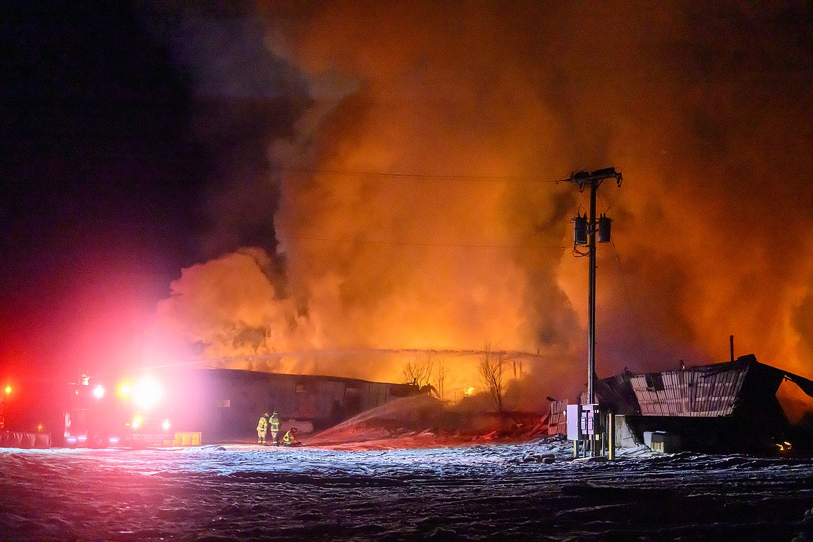 Numerous fire departments at this hour are fighting a massive blaze at a firewood processing mill off Helena Flats Road.