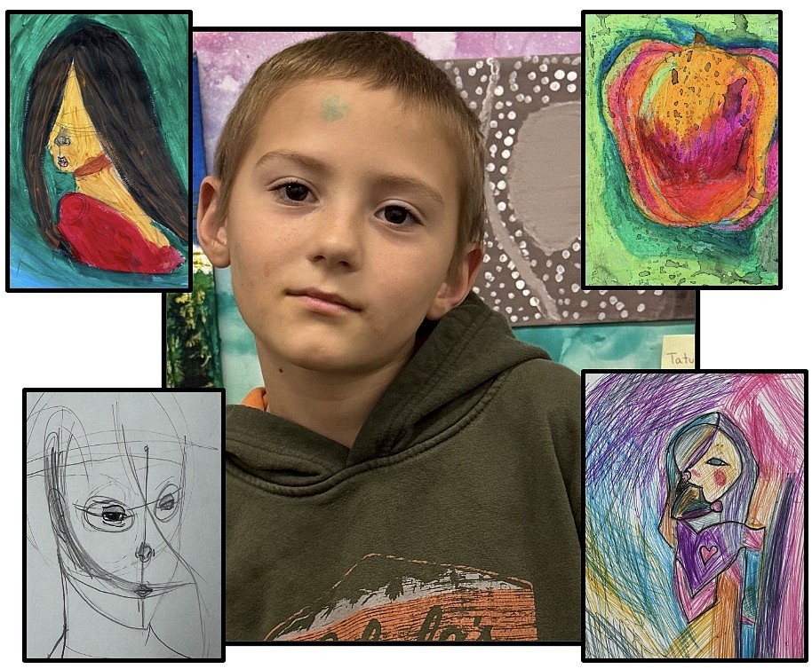 Ezra Hartman, a second-grade student at Noxon Elementary School, met us in the hallway and escorted us to his art classroom. There, one at a time, he began pulling out drawing and paintings like valued items from a treasure chest.