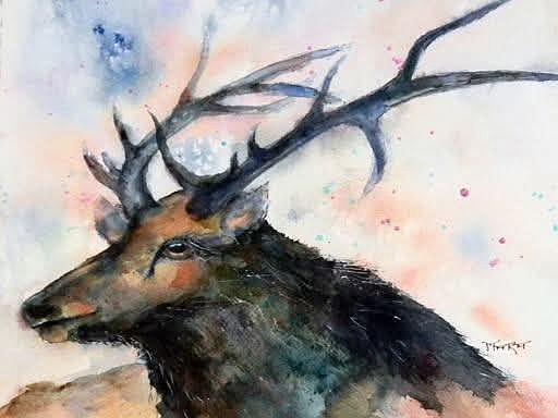 Many of her paintings feature a moose that has visited her yard on several occasions, as well as other wildlife and landscapes.