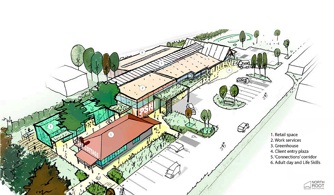When city officials let them know the lease for the property would not be extended, Nicholson said PSNI began looking to the future. The organization purchased the site at 1407 N. Boyer and moved The Cottage onto what will be its new campus. They hired North Root to help them map out that plan, creating the multi-phase approach to create a campus that blends retail space, work services and its greenhouse as well as its adult day and Life Skills programs.