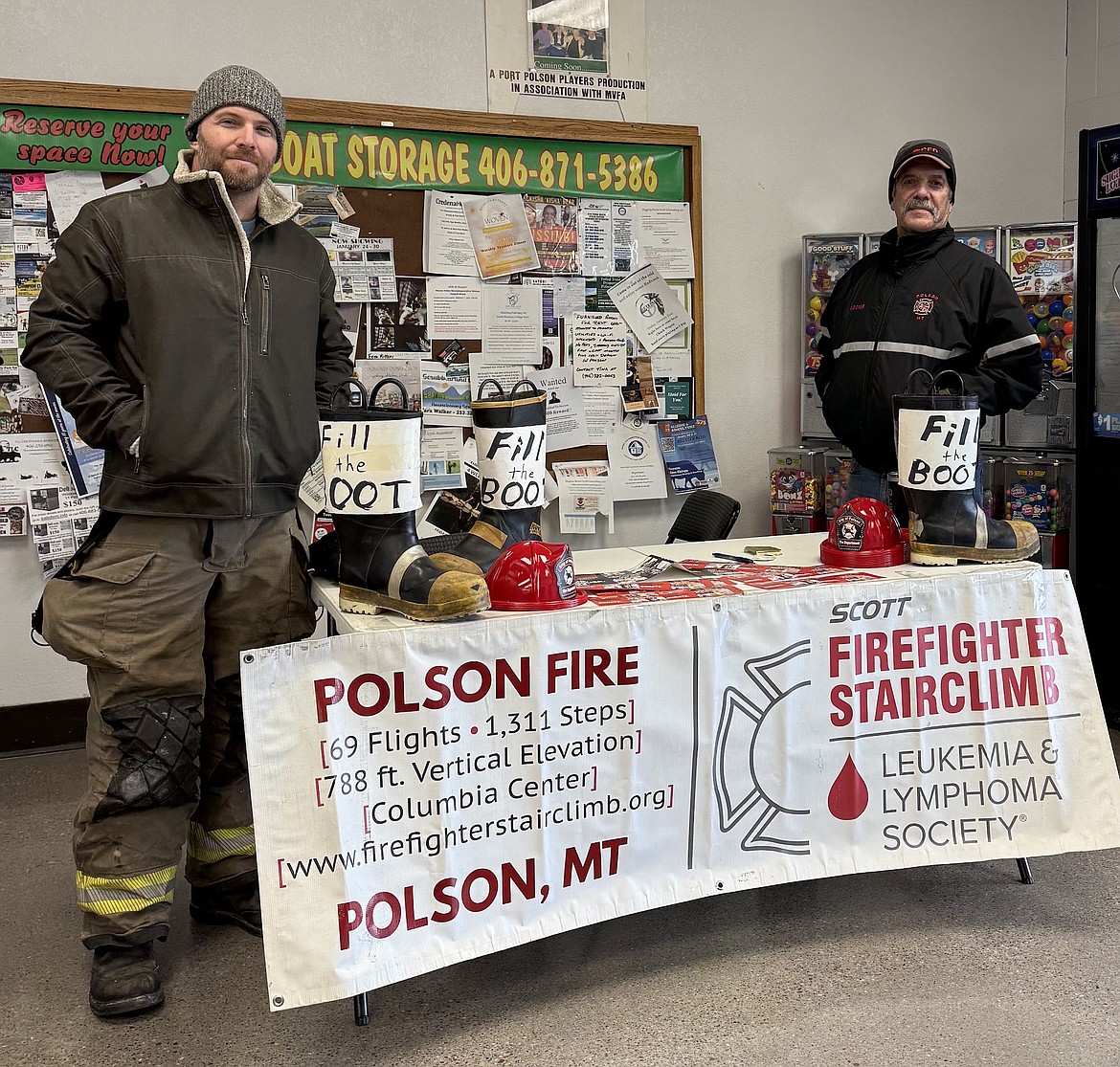 Firefighters from the City of Polson were holding out big black boots at Super One last Thursday, in hopes of enticing shoppers to drop some dollars inside. The volunteer fire department hopes to raise $12,000 for the Firefighter Stairclimb, held March 9 in Seattle.