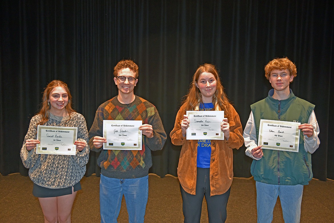 First - Scarlet Burke, "When I Am Asked" by Lisel Mueller; second - Jake Dunker, "Do Not Go Gentle Into That Good Night" by Dylan Thomas; third - Samantha Keim, "Invictus" by William Ernest Henley; and in fourth was Ethan Amick, "I Wandered Lonely As A Cloud" by William Wordsworth.