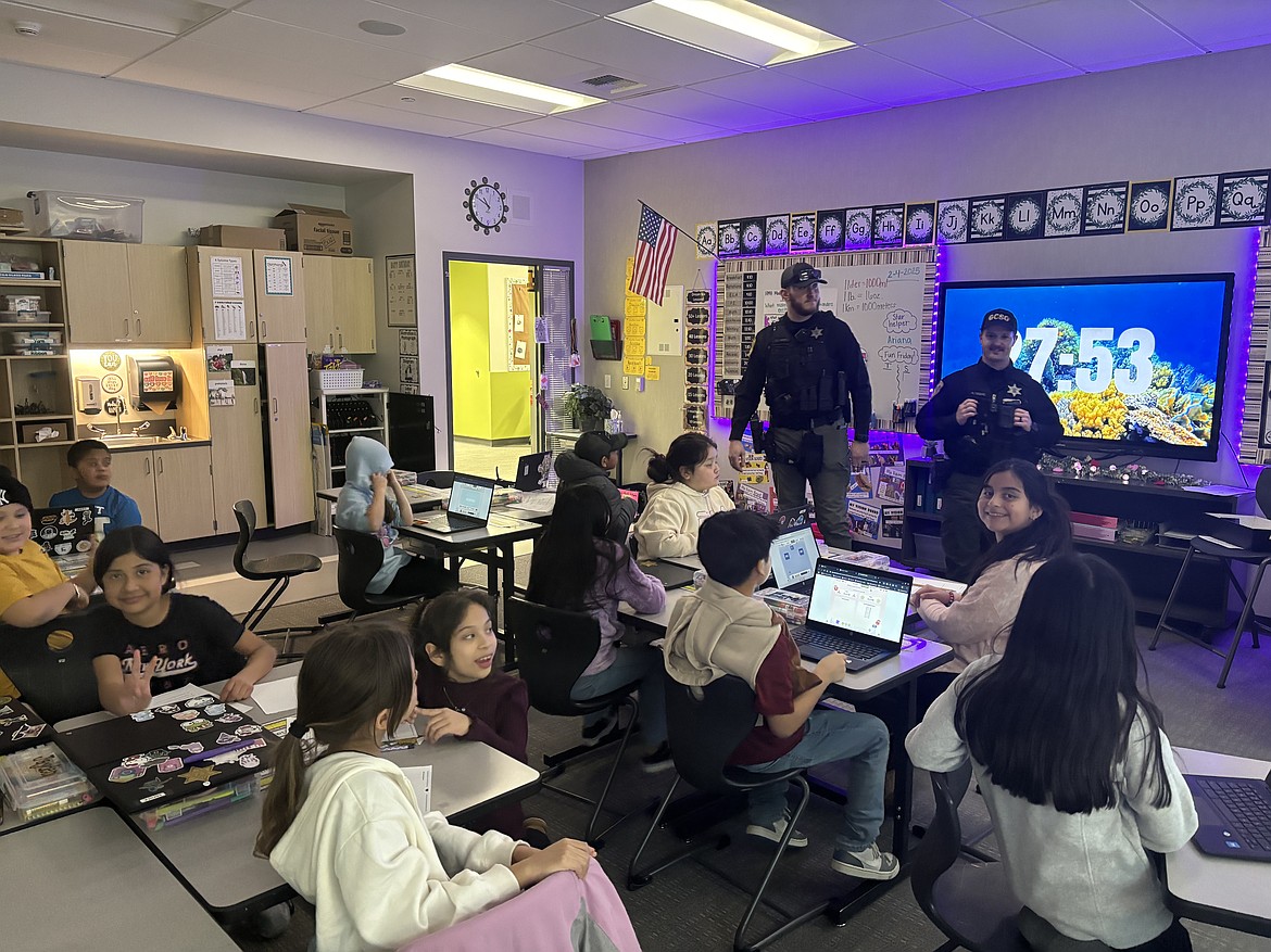 QUINCY – Grant County Sheriff’s Office Deputies Aaron Young and Gunnar Hinds stopped by George Elementary in Quincy to talk with fourth grade students Tuesday.