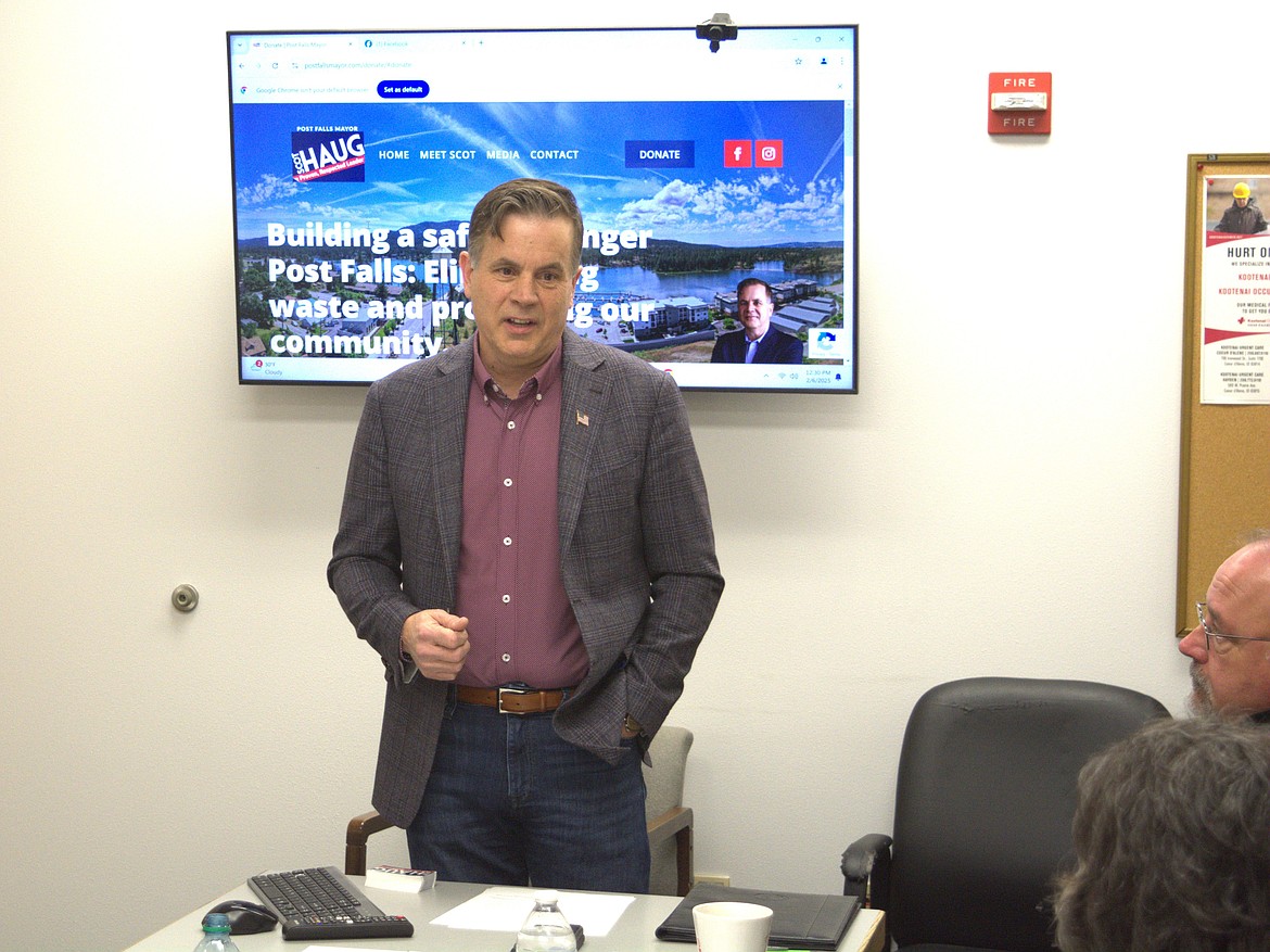 POST FALLS — Scot Haug announced his candidacy for Post Falls mayor and advocated for smaller government with less red tape for businesses on Thursday.