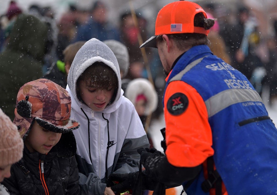Flathead Search & Rescue crew member gives out goodies at the 66th annual Whitefish Winter Carnival Grand Parade on Feb. 8, 2025. (Kelsey Evans/Whitefish Pilot)