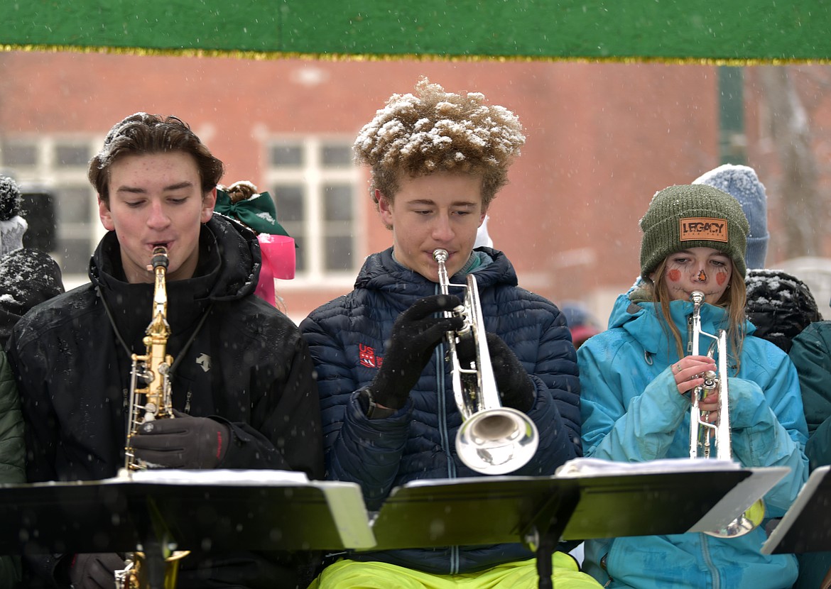 Whitefish High School band members at the 66th annual Whitefish Winter Carnival Grand Parade on Feb. 8, 2025. (Kelsey Evans/Whitefish Pilot)