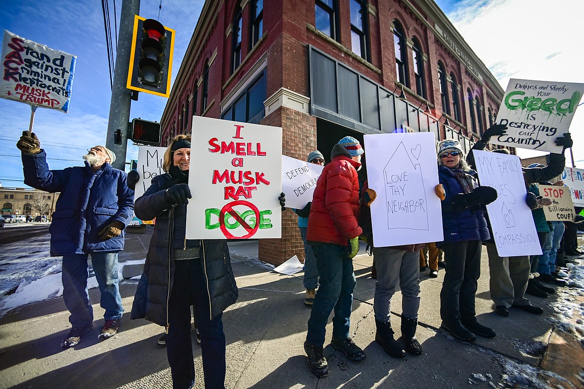 In Kalispell on Feb. 10, protestors hoisted signs calling for the removal of Musk, who has been named a special government employee by the White House, and objecting to federal spending cuts implemented under his watch. A few motorists honked as they drove by the demonstration.