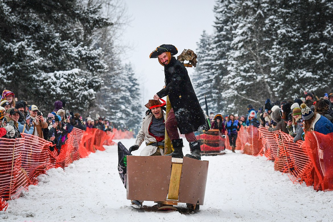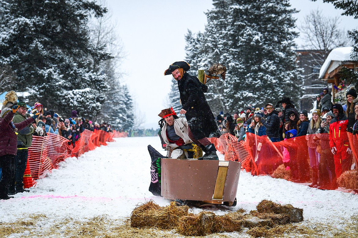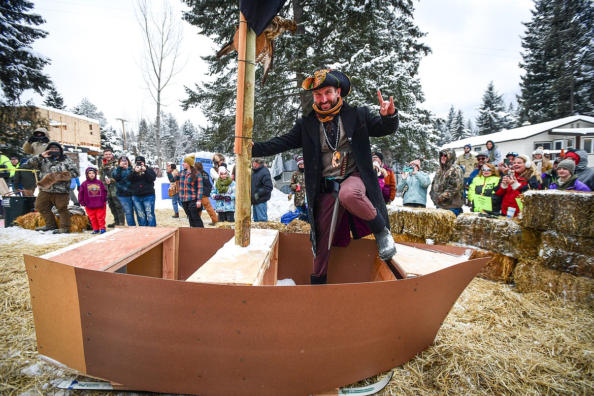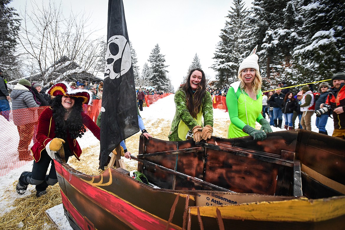 Participants dressed as pirates race down Sugar Hill at the Barstool Ski Races at Cabin Fever Days in Martin City on Saturday, Feb. 15. (Casey Kreider/Daily Inter Lake) Casey Kreider