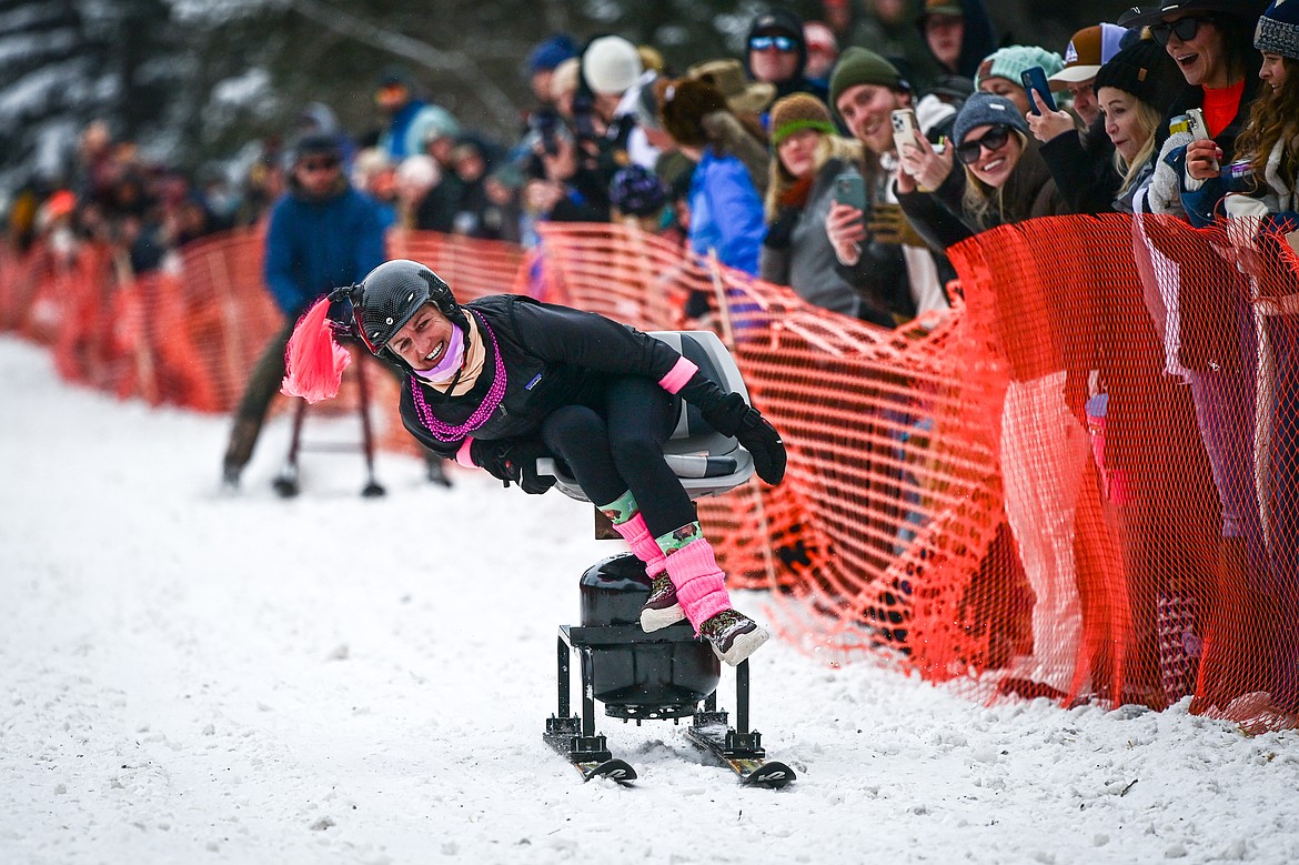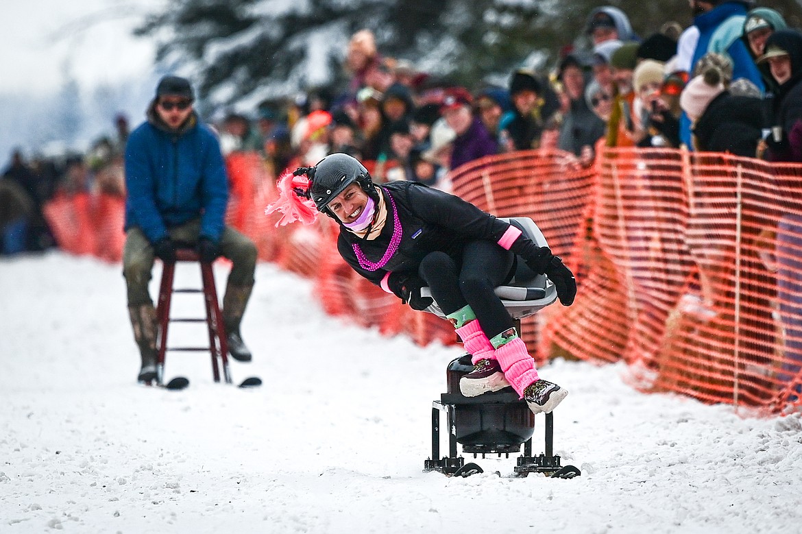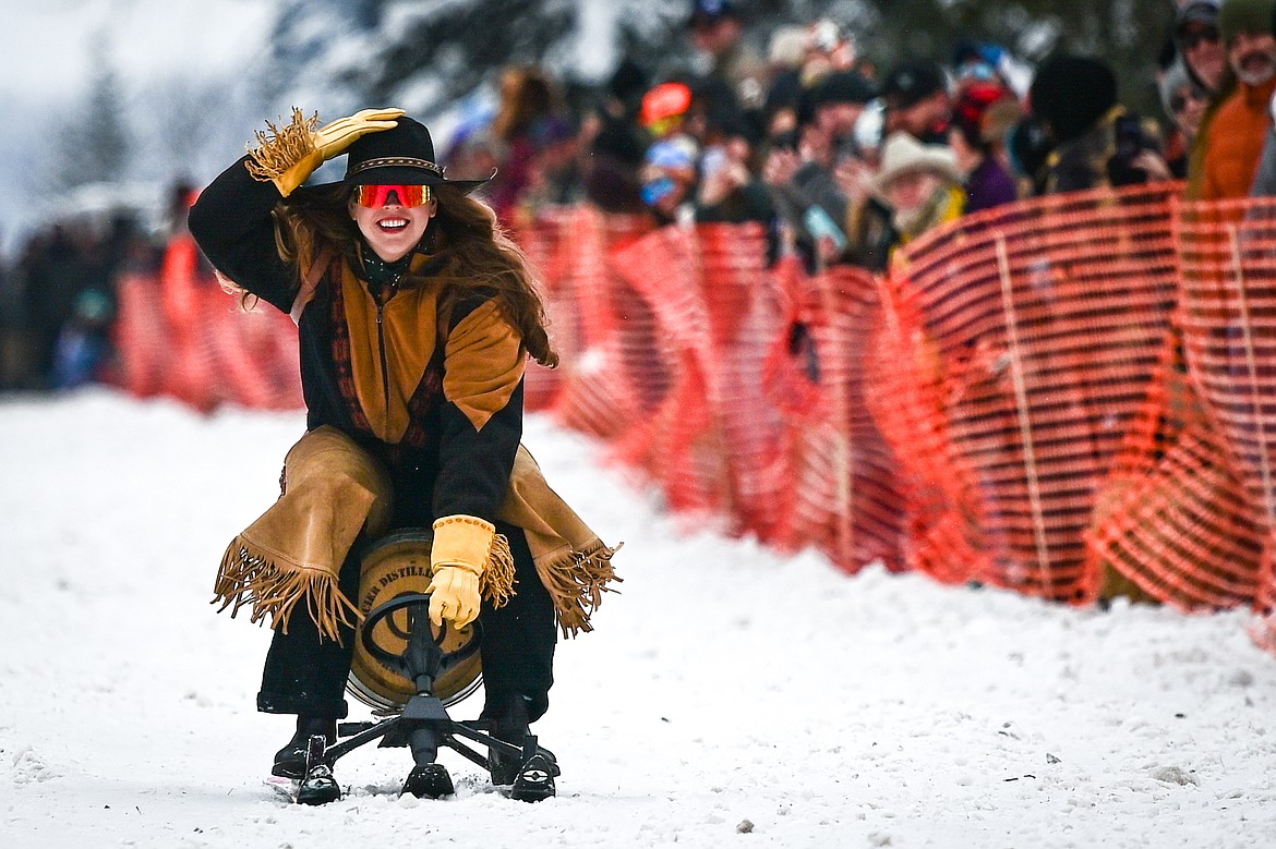 Participants race down Sugar Hill at the Barstool Ski Races at Cabin Fever Days in Martin City on Saturday, Feb. 15. (Casey Kreider/Daily Inter Lake) Casey Kreider