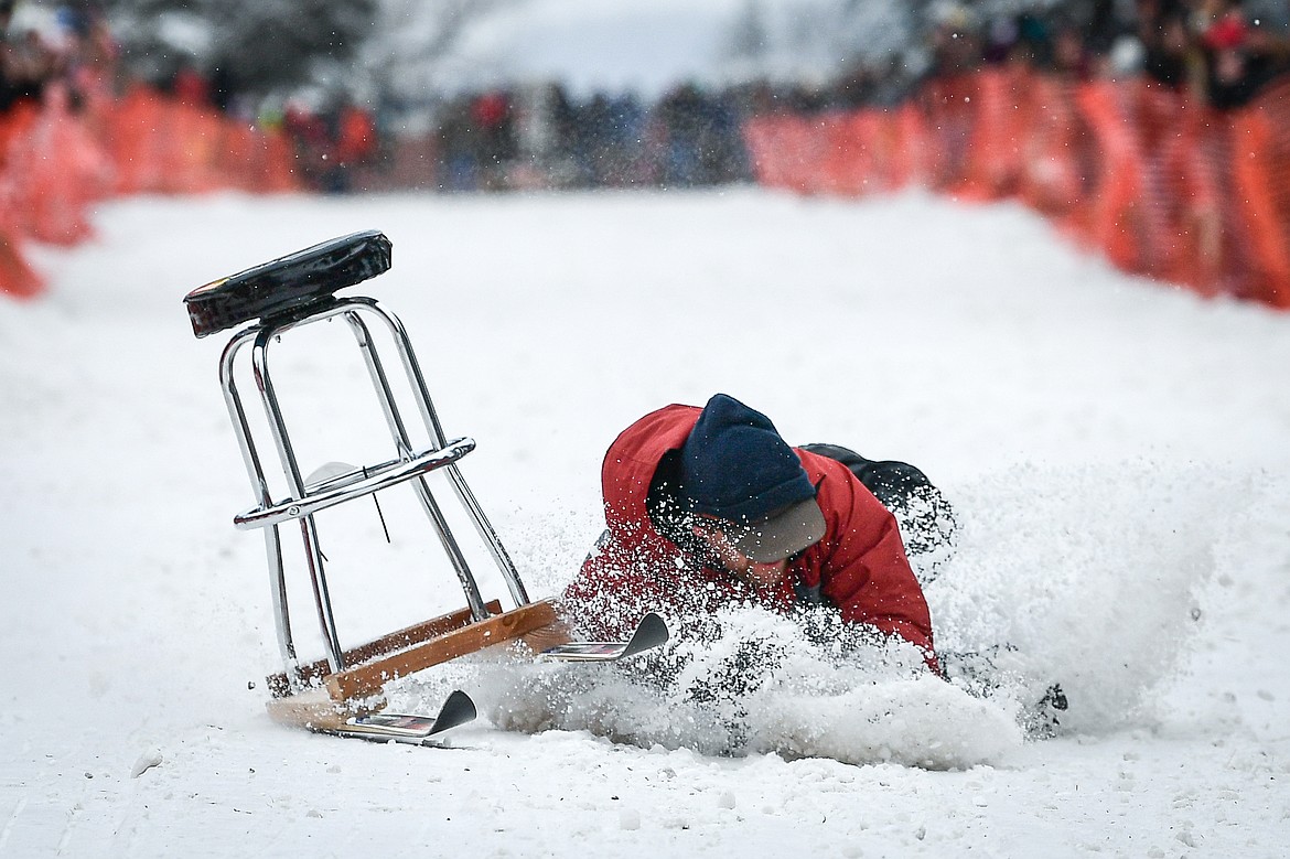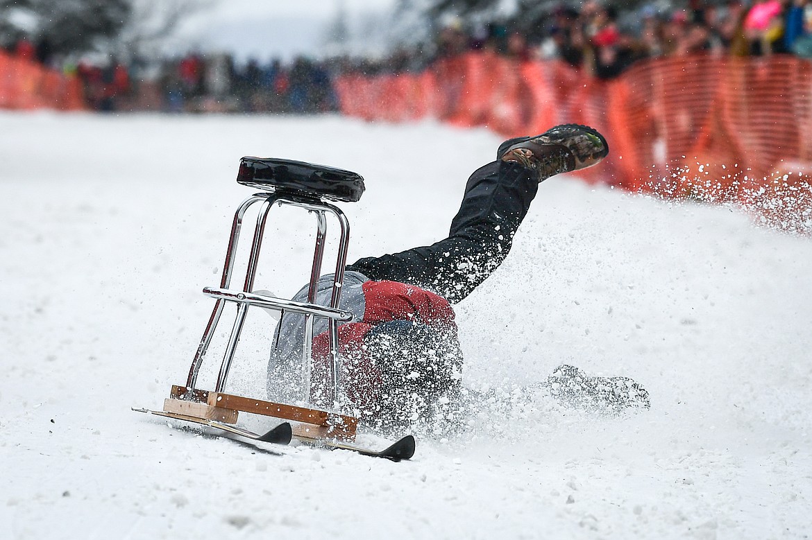 Participants crash at the finish line at the Barstool Ski Races at Cabin Fever Days in Martin City on Saturday, Feb. 15. (Casey Kreider/Daily Inter Lake)