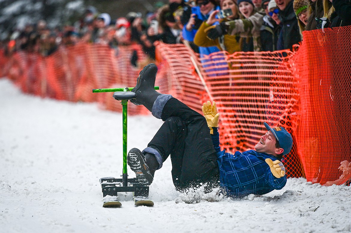 A racer crashes coming down Sugar Hill at the Barstool Ski Races at Cabin Fever Days in Martin City on Saturday, Feb. 15. (Casey Kreider/Daily Inter Lake) Casey Kreider