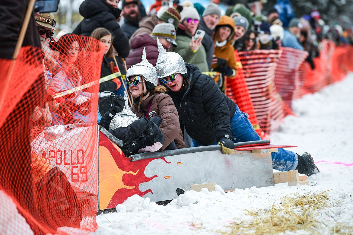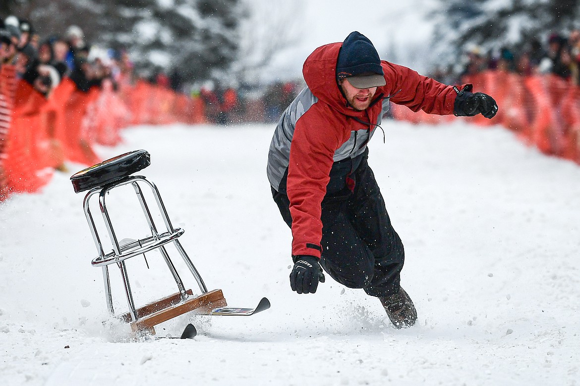 Participants crash at the finish line at the Barstool Ski Races at Cabin Fever Days in Martin City on Saturday, Feb. 15. (Casey Kreider/Daily Inter Lake) Casey Kreider
