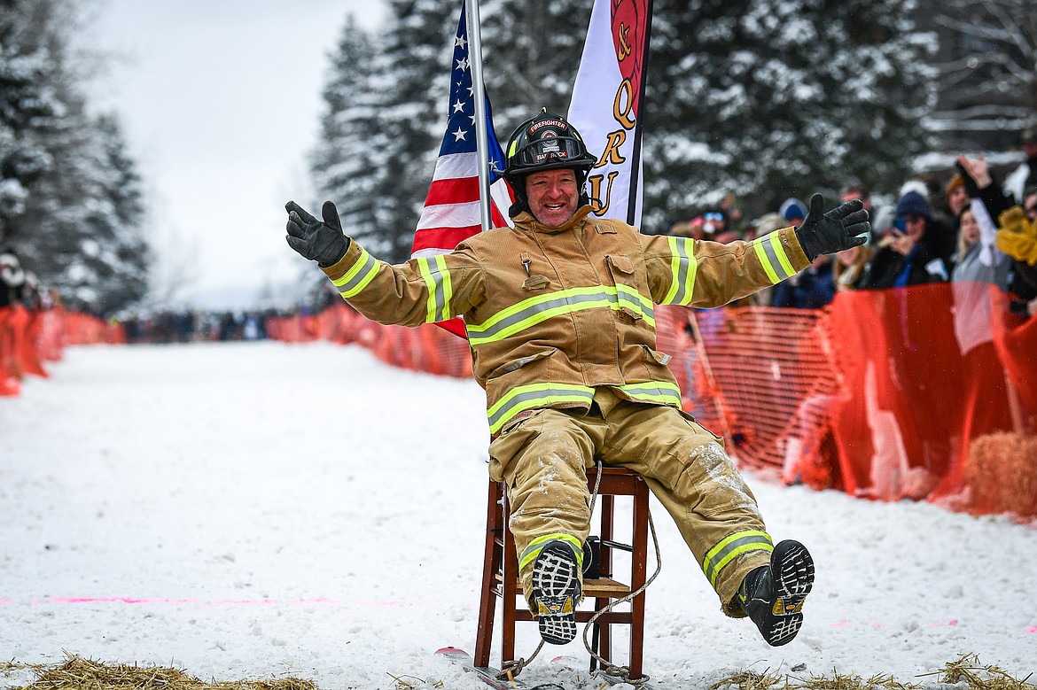 A participant celebrates at the finish line at the Barstool Ski Races at Cabin Fever Days in Martin City on Saturday, Feb. 15. (Casey Kreider/Daily Inter Lake) Casey Kreider