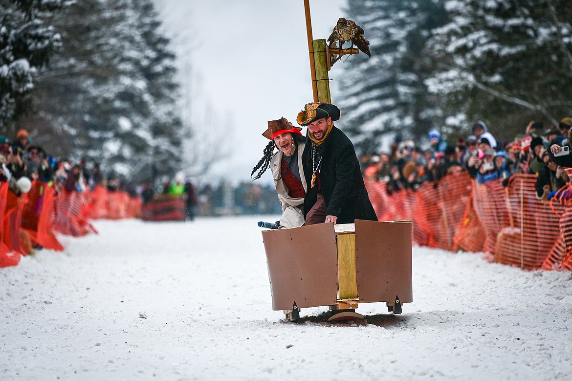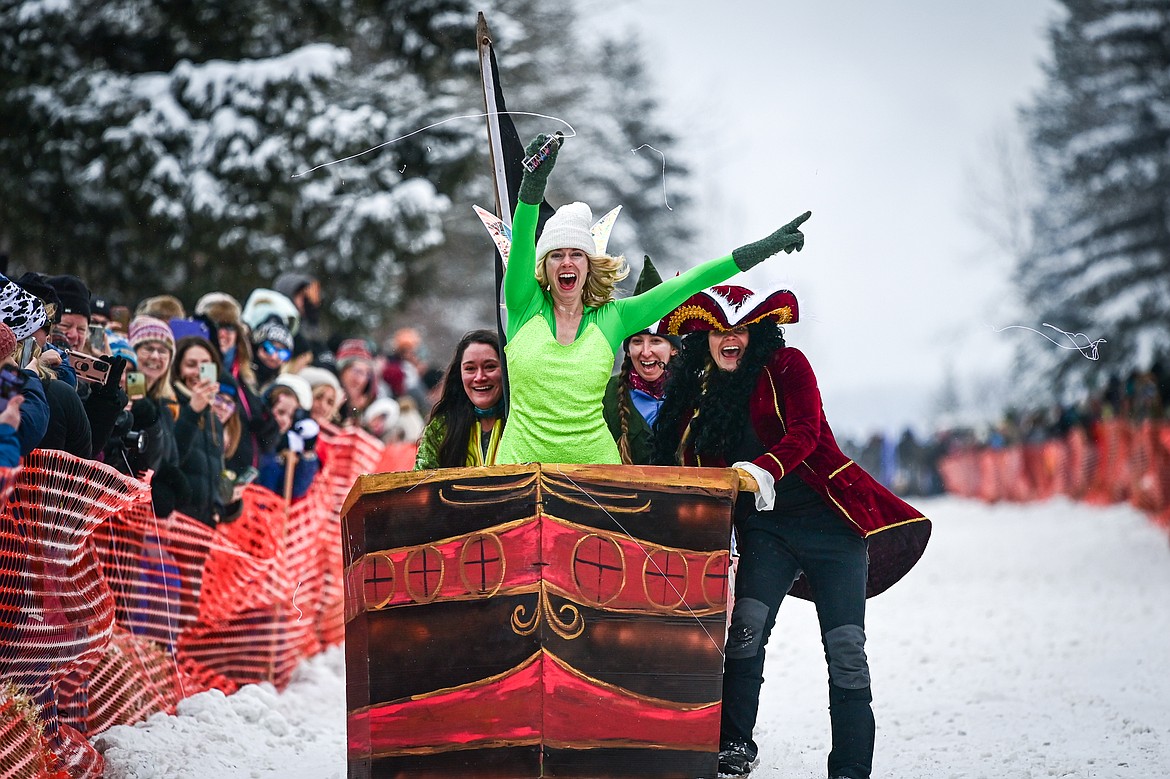 Participants dressed as pirates race down Sugar Hill at the Barstool Ski Races at Cabin Fever Days in Martin City on Saturday, Feb. 15. (Casey Kreider/Daily Inter Lake)