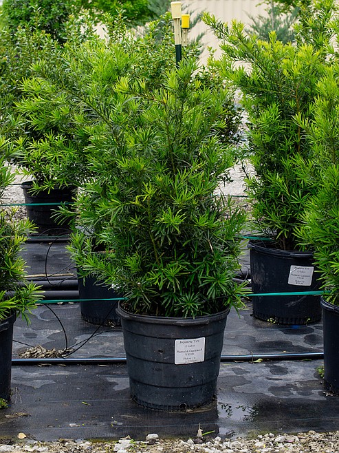 Japanese yew has flat, green leaves that are darker on the top than on the bottom, with 1- to 1.25-inch needles spiraling around the stem. Female plants produce bright red berries in late summer/early fall, while male plants produce flowers that may resemble tiny Brussels sprouts. All parts of the plant are toxic.