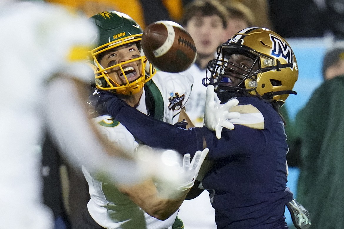 Montana State defensive back Andrew Powdrell, right, defends against a pass intended for North Dakota State wide receiver Bryce Lance during the first half of the FCS Championship NCAA college football game, Monday, Jan. 6, 2025, in Frisco, Texas. (AP Photo/Julio Cortez)