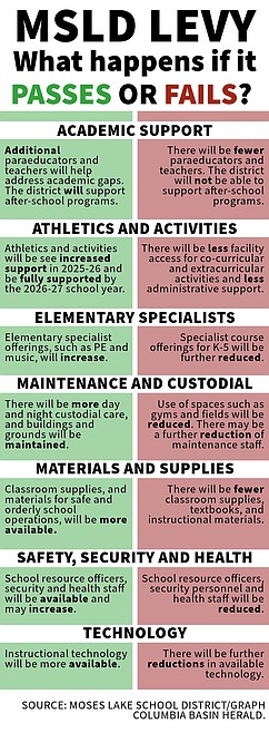 “The levy is important to Moses Lake School District, and really all school districts across the state of Washington, because levies are how things that the state considers extra are funded for students,” Superintendent Carol Lewis said. “Some examples of those things would be athletics and activities, specialty courses that kids may take, like AP courses or having music programs in our elementary schools. Those things are not considered part of a basic education from the state, and they are expected to be parts of kids' education.”