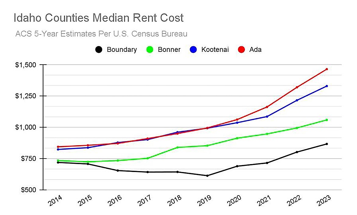 But compared to other North Idaho counties, Boundary’s inflation rate is significantly lower. Ten years ago, the typical rental in Boundary and Bonner counties was about the same. Now, the median rental cost in Bonner County is almost $200 a month higher.