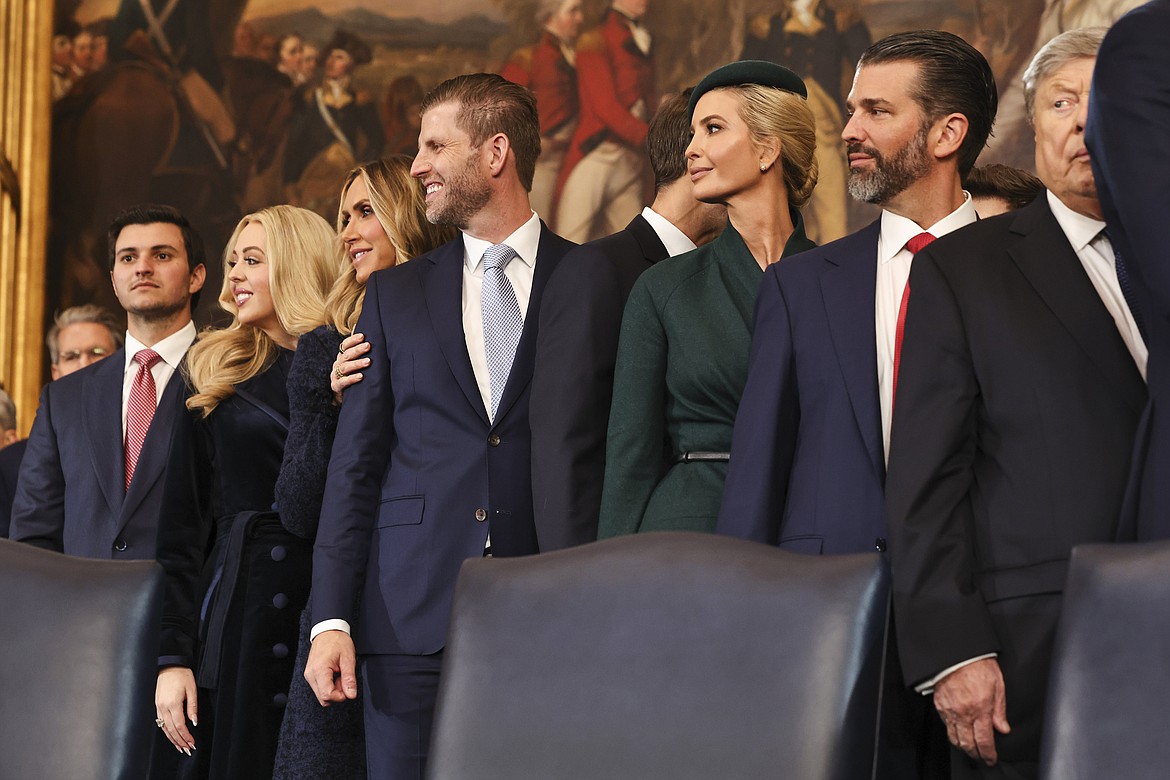 From left, Michael Boulos, Tiffany Trump, Lara Trump, Eric Trump, Jared Kushner, Ivanka Trump and Donald Trump Jr. at the 60th Presidential Inauguration in the Rotunda of the U.S. Capitol in Washington, Monday, Jan. 20, 2025. (Chip Somodevilla/Pool Photo via AP)
