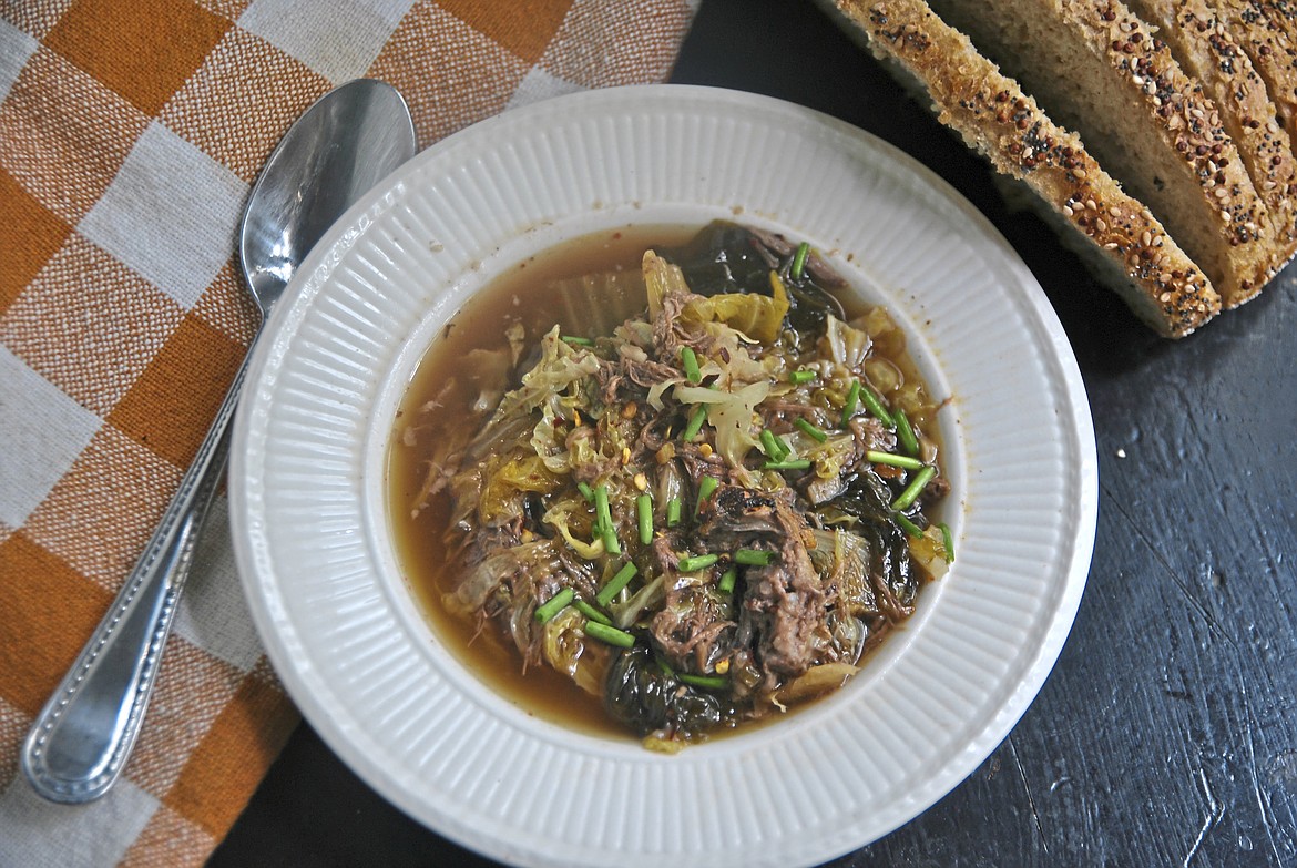 Using a slotted spoon, remove onions from slow cooker and discard. Transfer beef to a large bowl and coarsely shred it using 2 forks. (I picked out the fat.) Return beef to slow cooker. Stir in cabbage, salt and pepper and kimchi.