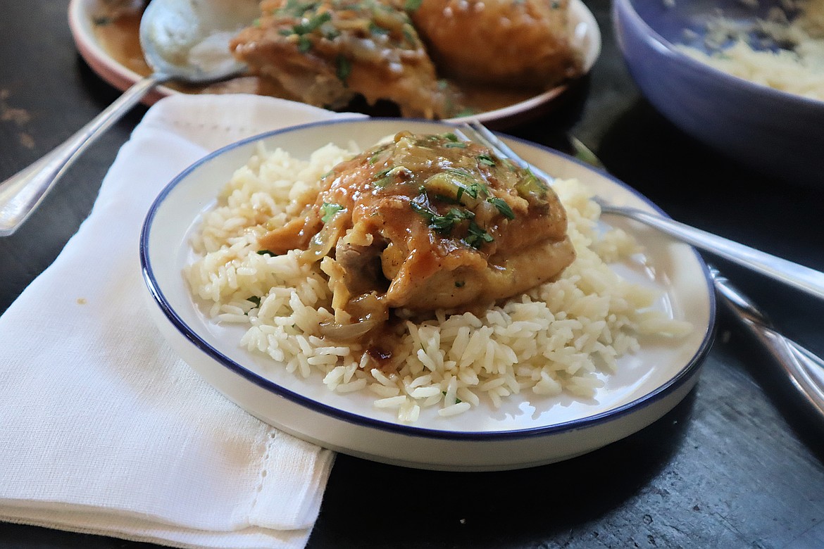 I served it with rice but you also could spoon the chicken over potatoes. I used bone-in chicken thighs.