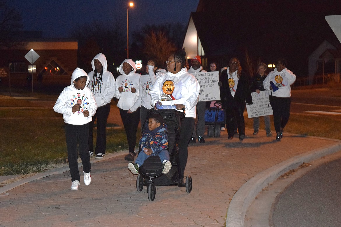 MOSES LAKE — Monday night, a group of around 35 people wearing white hoodies blared and sang to music as they walked down Fifth Avenue as the sun set on downtown Moses Lake. The group shared laughs. The children ran and teased one another. Signs were waved proudly at passing cars.