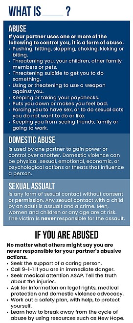 In instances where someone does not feel safe, Burkley said the first step should be to call 911. Then, reach out to resources such as New Hope to establish a safety plan and gain access to safety supplies. The organization makes customizable safety plans depending on each person’s situation.
