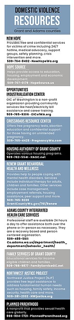 “If you or someone you know is experiencing domestic violence, there is help available, and in Grant and Adams counties, you could seek help for DV or sexual assault or relationship violence by contacting New Hope at 888-560-6027 and people can also access their services by contacting law enforcement,” Foreman said.
