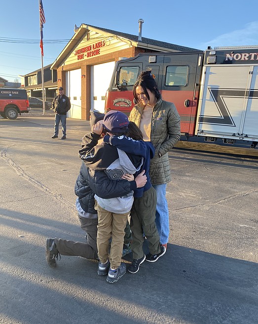 Four North Idaho firefighters received a warm homecoming Tuesday after spending two weeks battling fires in Los Angeles, with Tyler Turrell's reunion with his sons, Doxon, Summit and Brixton, highlighting the emotional scene outside the Northern Lakes Fire Protection District station in Hayden.