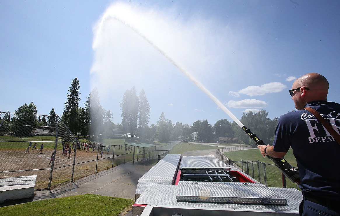 Coeur d'Alene Fire Capt. Nate Hyder hoses students with 500 gallons of water in July 2023 during a fire engine visit to Fernan STEM Academy on the final day of the CDA Reads program.