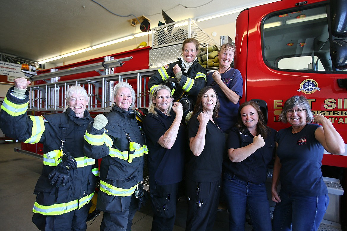 Several of the women who volunteer at East Side Fire District show off their guns at the Arrow Point Station in Harrison in June 2023. Back row, from left: Birgid Niedenzu and Lori Ador. Front row, from left: Carlene Cada, Robin Sand, Laurie Lamont, Tina Botai, Amber Loewe and Jo Moncrief.