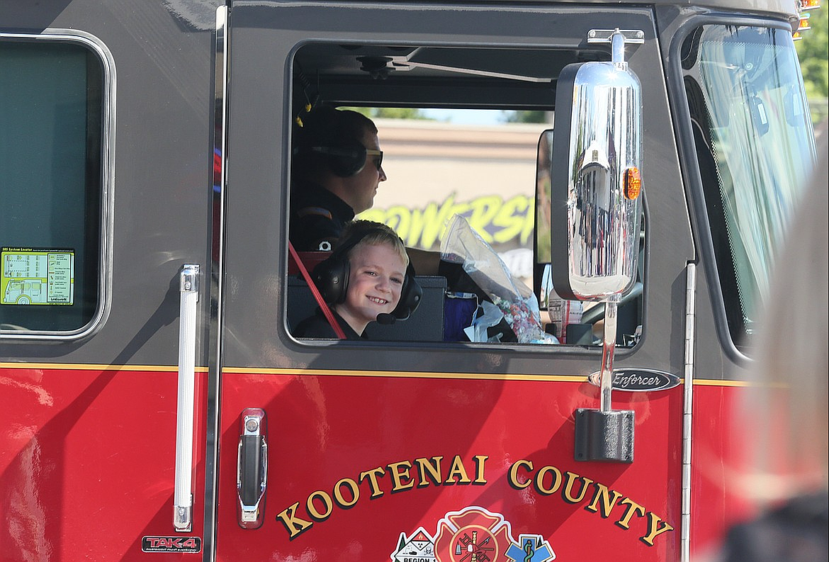Troy Carr smiles at the crowd as his dad, firefighter and EMT Taylor Carr, drives a Kootenai County Fire and Rescue truck in the 2022 Post Falls Festival Parade.